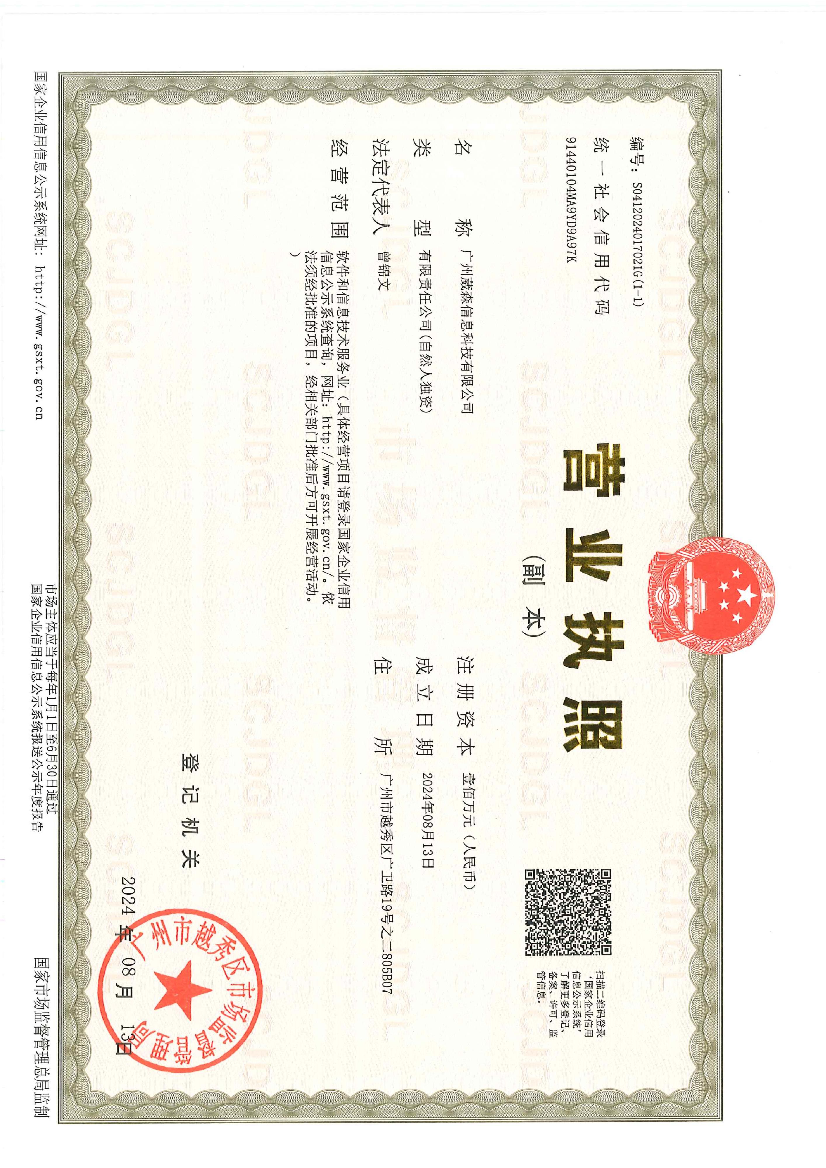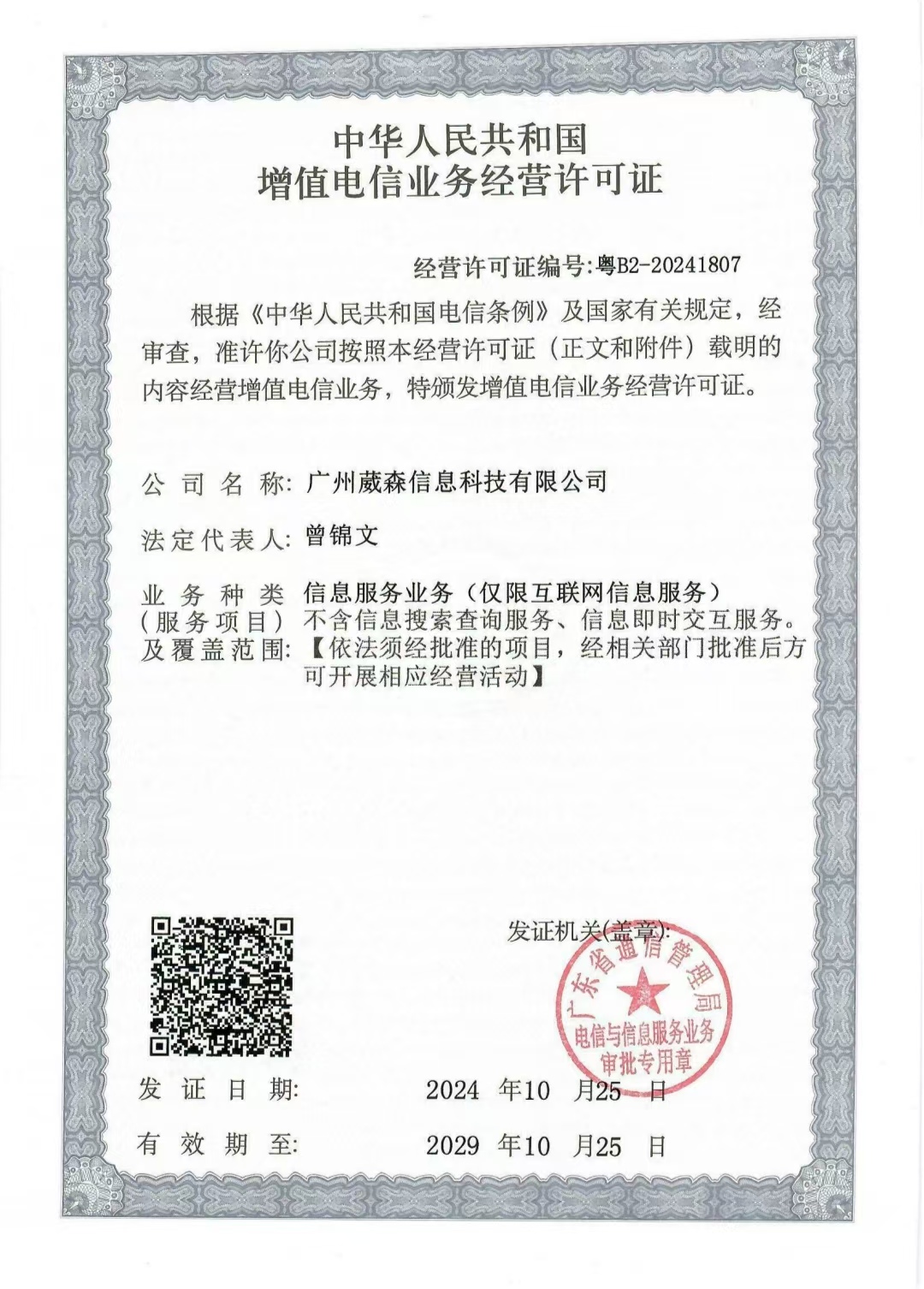 广州葳森信息科技有限公司成立于2024-08-13,法定代表人为曾锦文,注册资本为100万元,统一社会信用代码为91440104MA9YD9A97K,企业注册地址位于广州市越秀区广卫路19号之二805B07,所属行业为软件和信息技术服务业,经营范围包含:日用品销售;食品销售(仅销售预包装食品);化妆品零售;第二类医疗器械销售;食品互联网销售(仅销售预包装食品);化妆品批发;保健食品(预包装)销售;普通货物仓储服务(不含危险化学品等需许可审批的项目);日用杂品销售;网络与信息安全软件开发;网络技术服务;软件开发;技术服务、技术开发、技术咨询、技术交流、技术转让、技术推广;日用百货销售;技术进出口;食品进出口;货物进出口;日用品批发;信息技术咨询服务;软件外包服务;在线数据处理与交易处理业务(经营类电子商务);第二类增值电信业务。广州葳森信息科技有限公司目前的经营状态为在营(开业)企业。